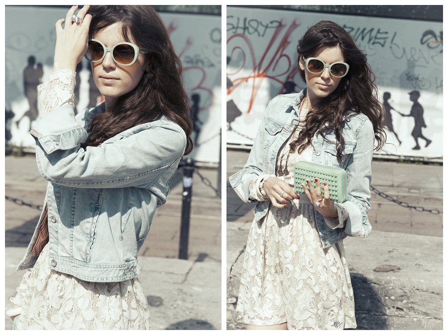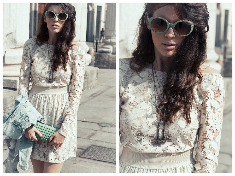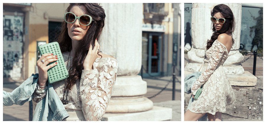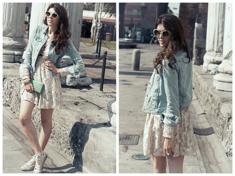 Un giorno con Emanuele Ferrari alle Colonne di Milano.. e decido per un outfit semplice, ma allo stesso tempo chic…Un divertente mix tra casual e “mini-couture” indossato con giacchino in jeans e abitino in pizzo.  In mano ho una divertente pochette verde acqua con pallini e il tutto condito con una scarpa da ginnastica e occhiali in tinta. In questo semplice outfit gli oggetti diventano i soggetti: sono proprio loro i più importanti del momento. Quando l’accessorio diventa il protagonista dell’outfit stesso. Vi piace? Un bacione.